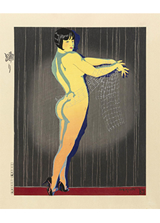 • At the Bath by Ishikawa Toraji (Japan, 1875-1964). Depicting a nude woman seated at her bath. From the series "Ten Types of Female Nudes (Rajo jusshu)". The manner in which nudity is depicted demonstrates a strong Western influence. However, the portrayal of beautiful women has long been a common subject in the Japanese woodblock print tradition. Published 1935. Carved by Yamagishi Kazue. Printed by Matsuzaki Keisaburo. Signed and sealed top right.