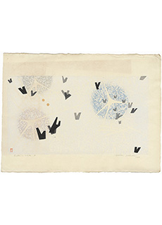 • Buddhist Statues by Hodaka Yoshida. An abstract interpretation of buddhist statues. Hodaka makes strong use of white space in this print to center the eyes attention on the impactful figures. Signed and titled in pencil by the artist. Dated 1954. Artist's red chop mark in the bottom left hand corner. Provenance: Estate of Jane Griffin, Bethesda, MD.