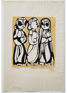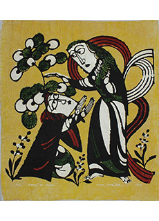 • Christmas by Sadao Watanabe. Folk art style Japanese print featuring one of the nativity scenes. This Mingei style of printing that Watanabe employed is an old method using crumpled paper and soybean milk paints to create a folky or even a stained glass effect. Dated 1964. Limited edition numbered 157 of 210.