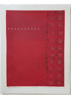 • Double Door by Hiroyuki Tajima. A signed limited edition woodblock print titled, Double Door circa 1973, by Japanese printmaker from the esteemed Sōsaku-Hanga school, Hiroyuki Tajima (1911–1984). Tajima is best known for his abstract woodblock prints that feature luminous colors, bold compositions and a strong sense of balance inspired by his Zen Buddhist beliefs. This woodcut depicts a large green rectangle with a teal top that is surrounded by a grey/brown border and has several thin white and blue strips stacked side by side near the center. This piece is pencil signed and dated by the artist in the lower right margin and is numbered “50-14” to the center with the title written to the left in English as well as Japanese. The print has a single white mat and is housed behind plexiglass in a simple metal frame with a wire for hanging to the verso.