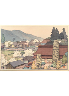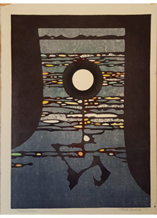 • Gagaku by Toshi Yoshida (Japan, 1911-1995). Signed and titled in pencil by the artist. Dated 1968. Limited edition numbered 27 of 120. Toshi trained under his father, Hiroshi Yoshida, mostly focusing on the shin-hanga approach to his prints. After his father died, Toshi began exploring more abstract designs, as well as self-publishing using the sosaku-hanga approach.
