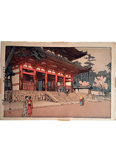 • In a Temple Yard by Hiroshi Yoshida Japanese woodblock print. From Hiroshi Yoshida's series Eight Scenes of Cherry Blossoms. Printed posthumously from the original blocks by Toshi Yoshida and Yoshida Studio. Artist's signature stamped in the block.