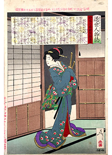 • Joganden Moon by Tsukioka Yoshitoshi (Japan, 1839-1892). A dynamic Meiji era ukiyo-e Japanese woodblock print. From the series 100 Aspects of the Moon, titled Joganden Moon Minamoto no Tsunemoto killing a demon in the form of a stag. Published by Akiyama Buemon in 1891.