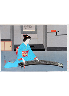 • Playing The Samise by Keiko Yurimoto. Original Japanese woodblock print. Date: 1950/1960s.