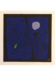 • Modernist textured woodblock print titled "Poem 90-82" by Haku Maki. Thick impasto with Kanji style figures. Limited edition numbered 23/152. Dates to 1990. Pencil signed by artist in lower margin with artists red seal in the lower left.