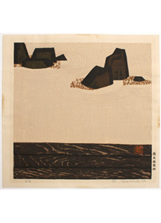 • Untitled (Barren Landscape) by Hashimoto Okiie (Japan, 1899-1993). A sosaku hanga Japanese woodblock print depicting a barrend landscape. The print has a very unique perspective to it with multiple depths of perspective presented as one flat image. A beautiful and engaging work. Limited edition numbered 4 of 70. Pencil signed by the artist. Dated 1966.
