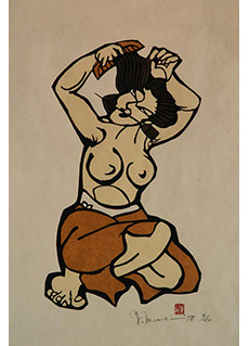 A beautiful work composed over a span of two years. The work depicts what looks to be a portrait of the same woman in different poses. The first painting was composed in 1985 and depicts the woman in a dress with her eyes closed smiling. The second work, done a year later in 1986, depicts what looks to be the same woman in the nude with a more sensual expression. In traditional Mori style there are elements of realism, combined with exaggerated features. This specific work also reminds me a bit of the style of Modigliani.