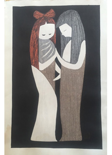 • Doves and Girl by Kaoru Kawano. Beautiful original woodblock print by well known contemporary Japanese artist Kaoru Kawano (1916 - 1965). It is pencil signed lower right, bears the red seal mark lower left. Stamped "Made in Japan" on the lower right and pencil notations on bottom margin reverse. Excellent impression and bleed through.