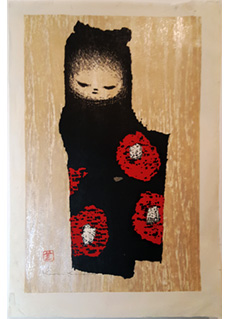 • Kneeling Girl by Kaoru Kawano. Small Japanese woodblock print depicting a young girl in a beautiful whimsical image. Pencil signed by artist.