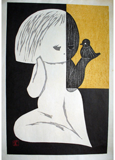 • Three Eyes by Kaoru Kawano. Vintage mid century Japanese woodblock. Dates to approximately 1960s.