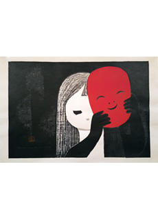 • Doves and Girl by Kaoru Kawano. Beautiful original woodblock print by well known contemporary Japanese artist Kaoru Kawano (1916 - 1965). It is pencil signed lower right, bears the red seal mark lower left. Stamped "Made in Japan" on the lower right and pencil notations on bottom margin reverse. Excellent impression and bleed through.