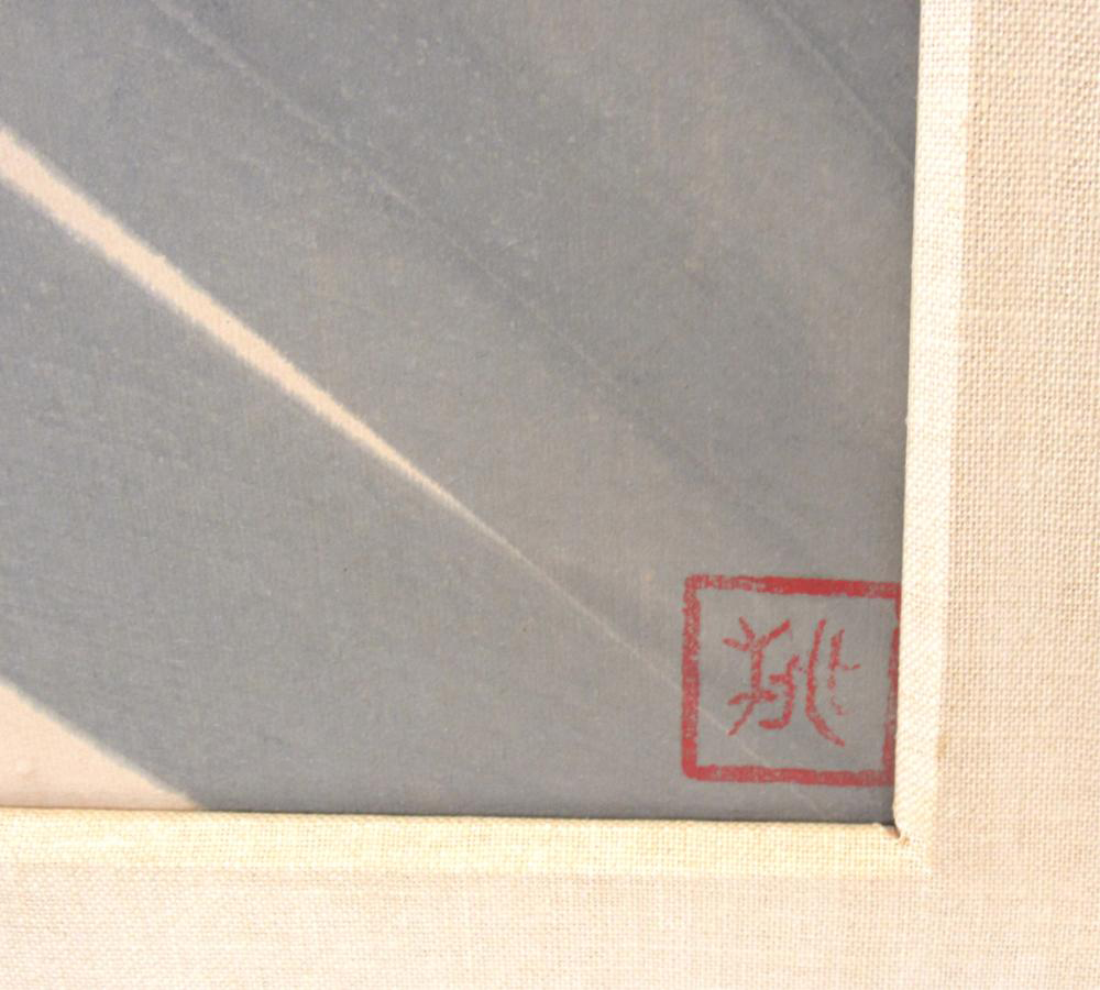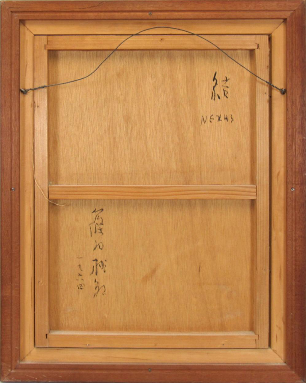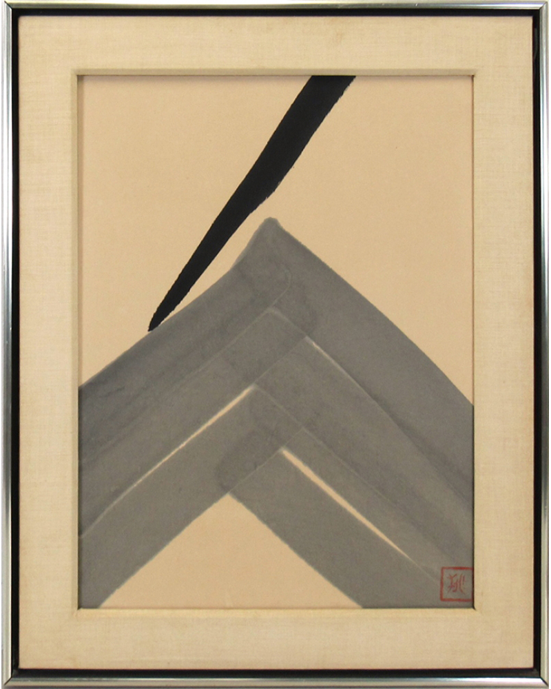 • Nexus by Toko Shinoda (Japan, 1913). A beautiful abstract sumi-e (Japanese ink) painting with strong lines and an elegantly minimal design executed by a clearly disciplined hand. Paper laid on board as is common for Toko Shinoda paintings of this period. Red chop mark bottom right. "Nexus" titled to verso, signed and dated 1964 in Japanese.